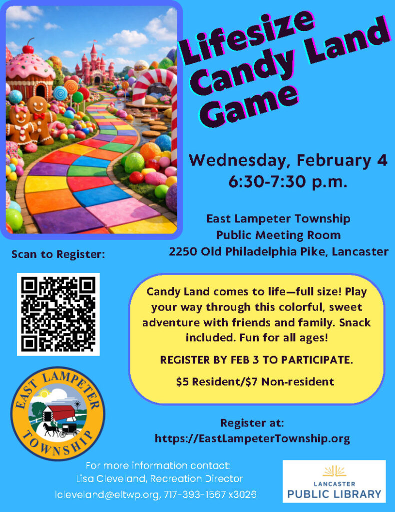 Step into a sweet adventure as Candy Land comes to life! Explore the Peppermint Forest, climb the Gumdrop Mountains, and cross the Chocolate Swamp. A snack will be provided—fun for the whole family!