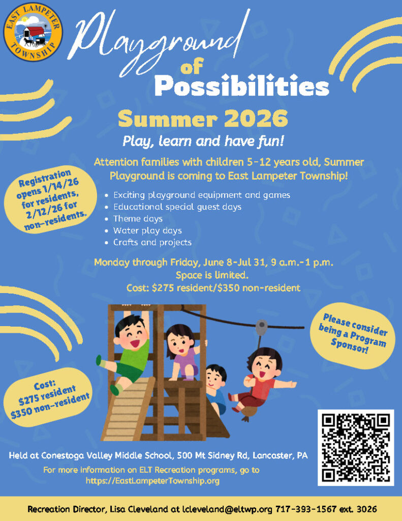 ELT Recreation, in partnership with the Conestoga Valley School District, is proud to offer A Playground of Possibilities, a summer playground program designed to encourage experiential learning through play.