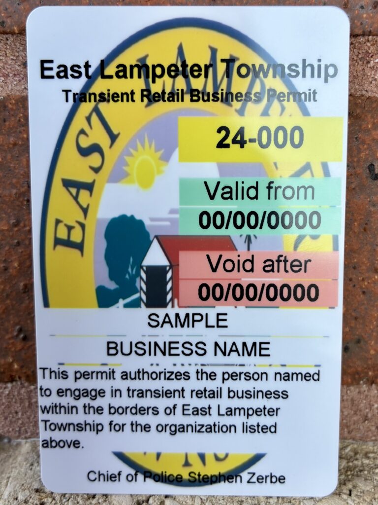 East Lampeter Township’s solicitation ordinance requires that all solicitors within the Township acquire a permit and register with the East Lampeter Township Police Department. Solicitors should have a permit that looks like the attached sample with their photo, name and business name available. Soliciting is limited to the hours between 9:00 AM and 8:00 PM. Residents should ask any solicitors that come to their property to show their Township permit. If the solicitor does not have a permit with them, please contact the Police Department. There are some exceptions to the ordinance, please see the full ordinance details here: https://ecode360.com/40571392